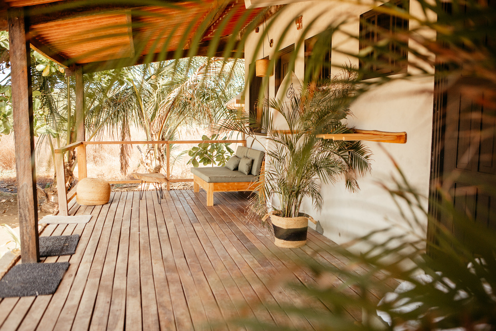 You’ll have a private bathroom and a private deck—a perfect spot for morning yoga, a quiet book, or listening to howler monkeys call through the canopy. The room is solar-powered and built using natural materials, letting the outdoors in while keeping you comfortably sheltered. Comes with a private surfboard rack, so your board stays safe, out of the sun, and ready for the next paddle out.